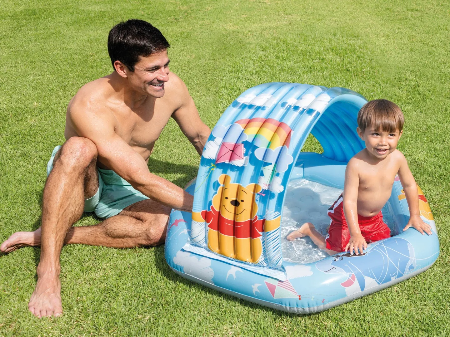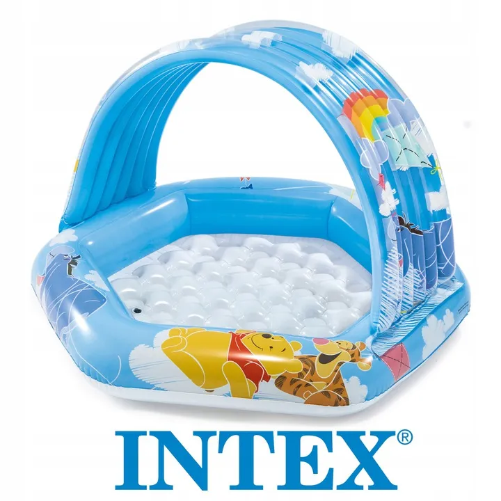 Dmuchany brodzik INTEX, daszkiem przypominającym piękne niebo. Wyjątkowy produkt z motywami z bajki Kubuś Pchatek i Przyjaciele sprawi, że Twoje dziecko pokocha zabawy w wodzie!