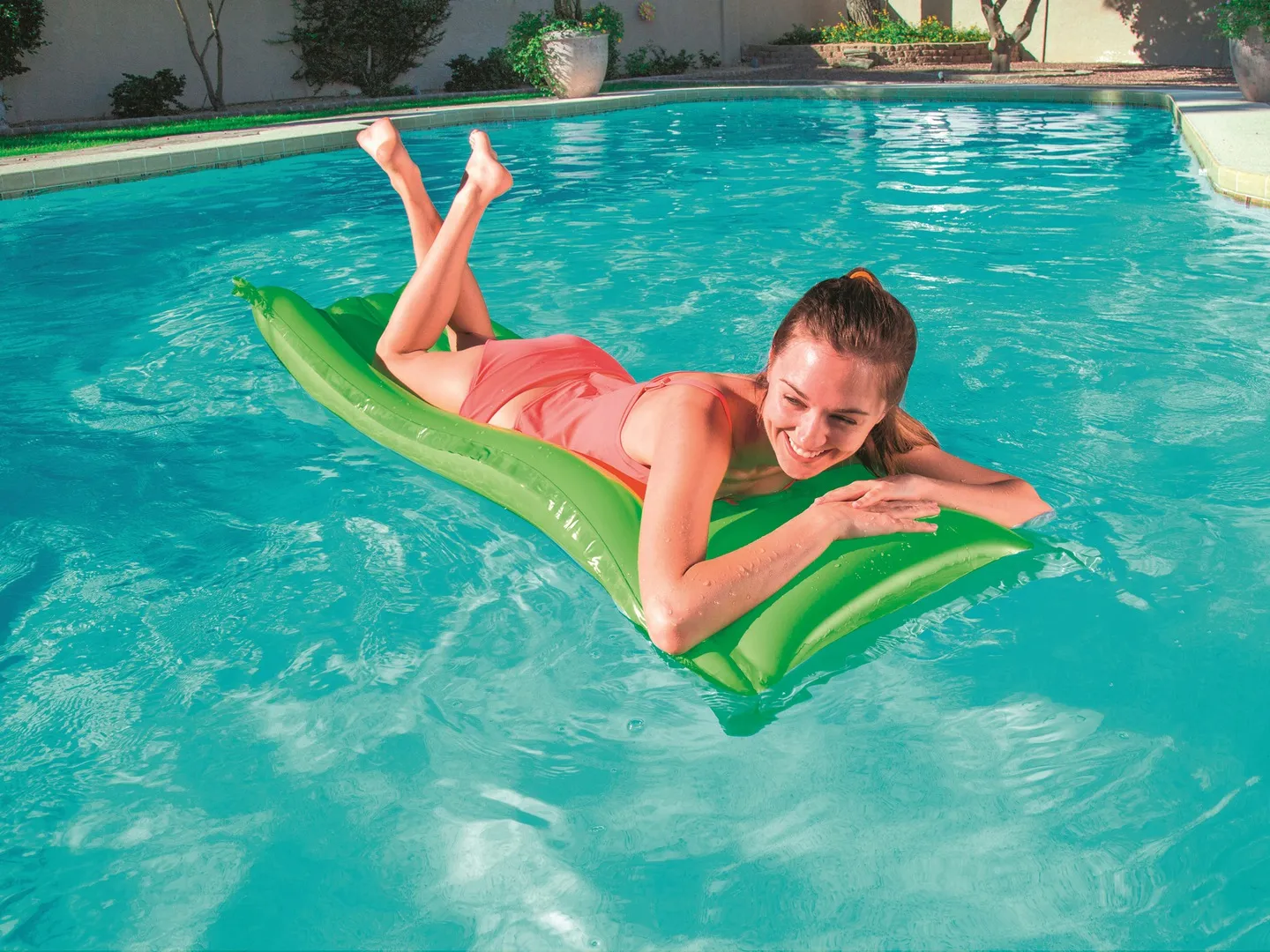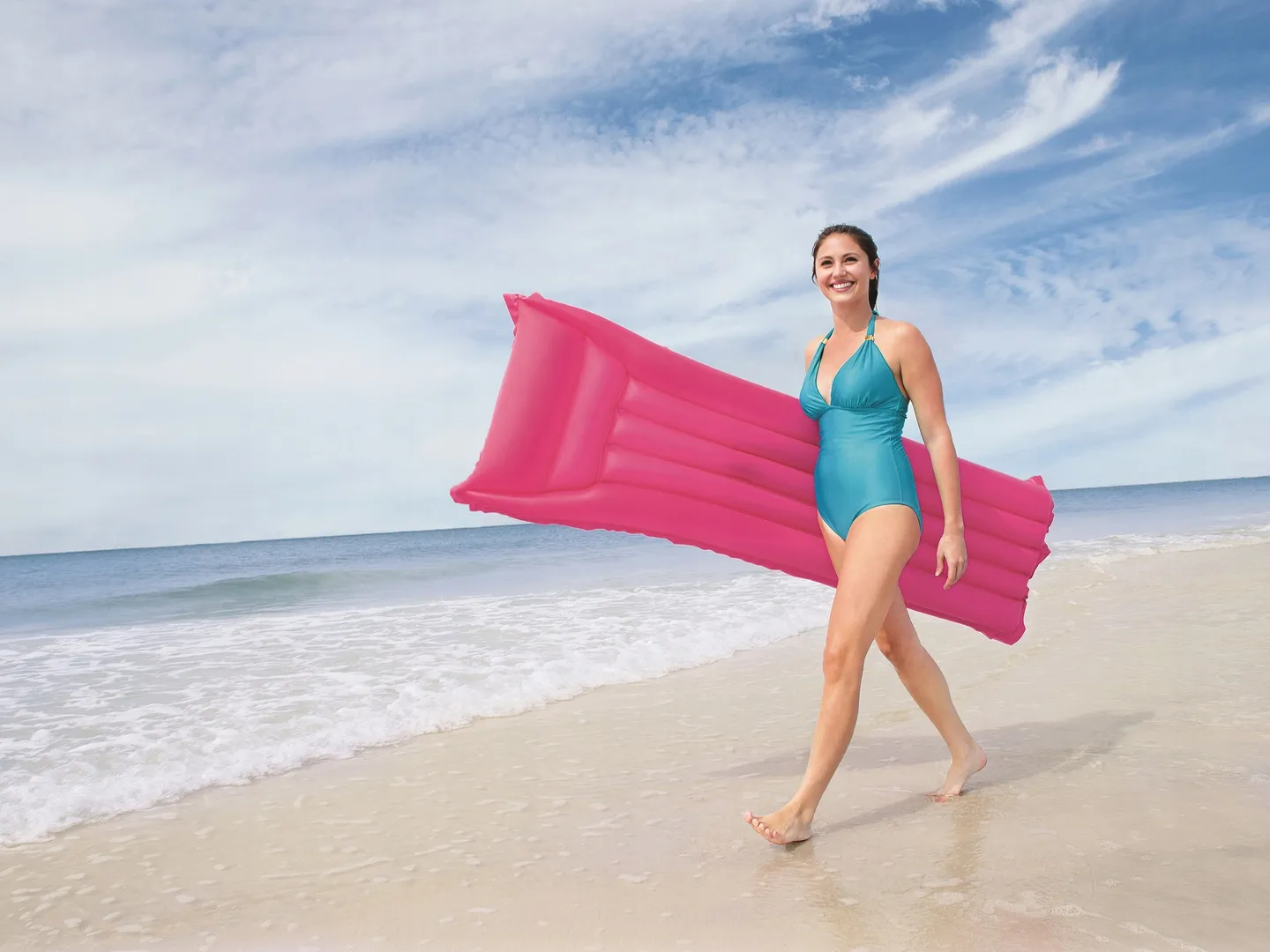Dmuchany materac do pływania z zagłówkiem świetnie sprawdzi się jako uzupełnienie wakacyjnego wypoczynku nad wodą.