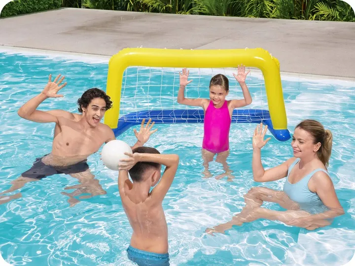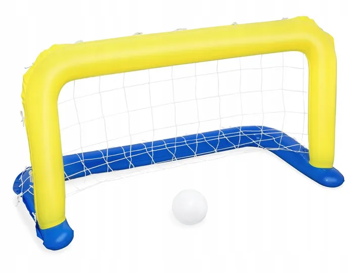 Bestway stworzył zestaw do zabawy, w której brać udział mogą nawet trzyletnie dzieci. Składa się on z dmuchanej bramki z nylonową siatką o wymiarach 142 cm x 76 cm i dmuchanej piłki.