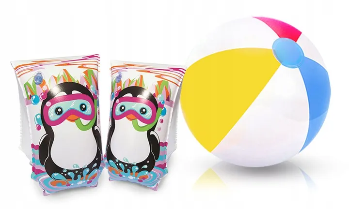 Ostrzeżenie: Rękawki do nauki pływania nie są zabawką, nie są sprzętem ratowniczym, nie zabezpieczają przed utonięciem. Do używania w wodzie na głębokości, na której dziecko wyczuwa dno pod nogami oraz pod nadzorem osoby dorosłej. Odpowiednie napompowanie i używanie sprzętu jest niezbędne dla zapewnienia bezpieczeństwa, nie nadmuchuj nadmiernie. Zwracaj uwagę czy zawór bezpieczeństwa jest szczelnie zamknięty oraz czy szwy nie są pęknięte. Zakres wagowy 18-30 kg, wiek od 3 do 6 lat. Akcesoria plażowe (piłki, kółka) widoczne na zdjęciach nie są elementem zestawu. Wszystkie elementy aukcji są chronione autorskim prawem majątkowym i nie zgadzamy się na ich kopiowanie.
