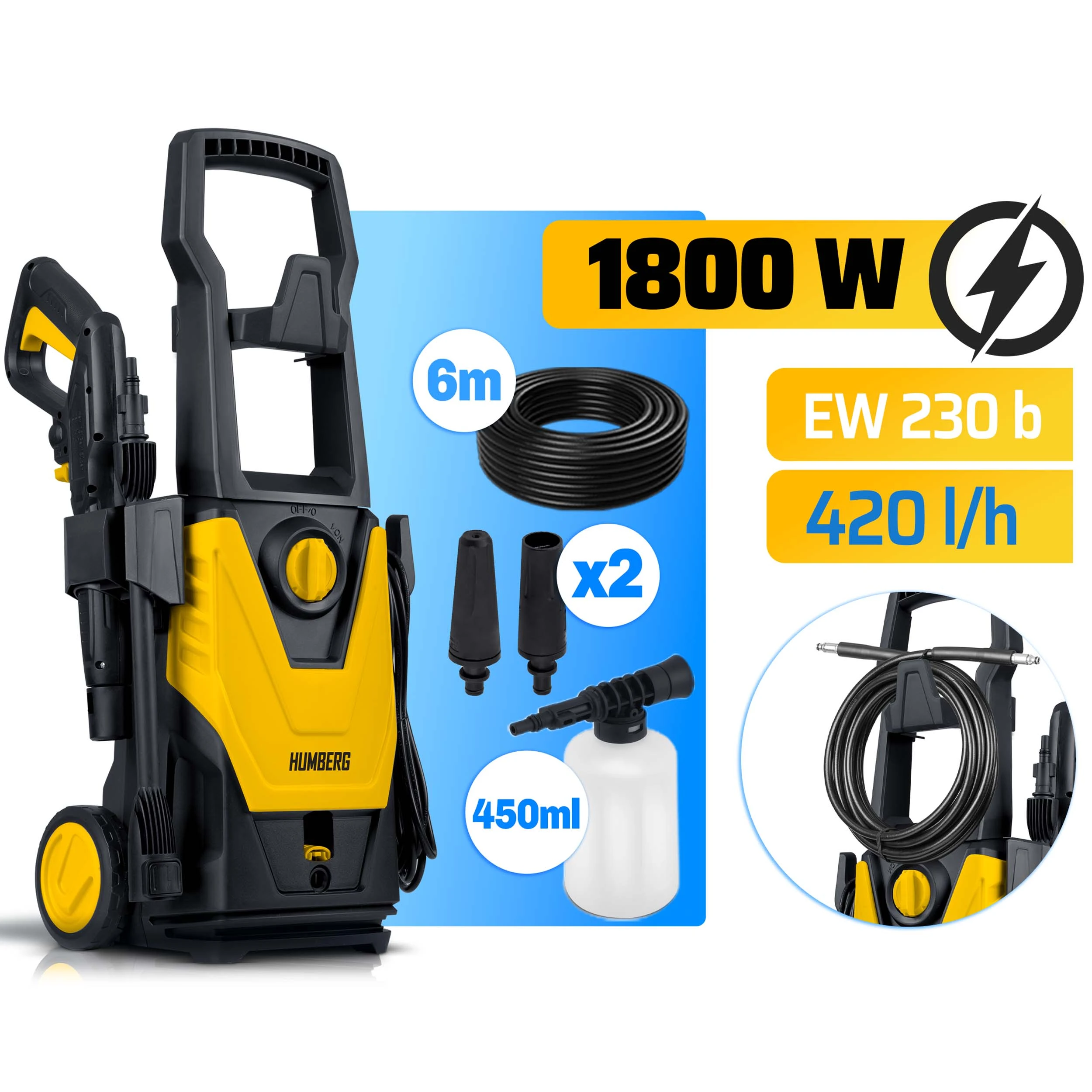 ✅REGULOWANA DYSZA ✅ ALUMINIOWA POMPA SAMOSSĄCA ✅ TURBODYSZA ✅ 6 M WĘŻA ✅ PIANOWNICA ✅ KABEL 5 M ✅ 1800 W ✅ MOC EW ✅ 230 BAR  ✅ MOŻLIWOŚĆ PODŁĄCZENIA CIEPŁEJ WODY DO 60℃