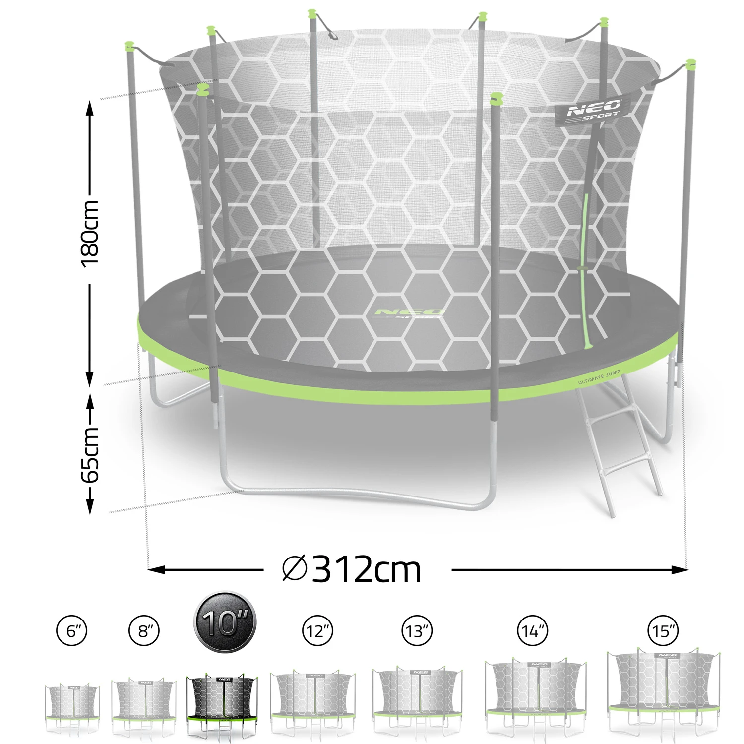 Trampolina NEO SPORT o imponującej średnicy 312 cm zapewnia mnóstwo miejsca do skakania – idealna dla dzieci i dorosłych!
