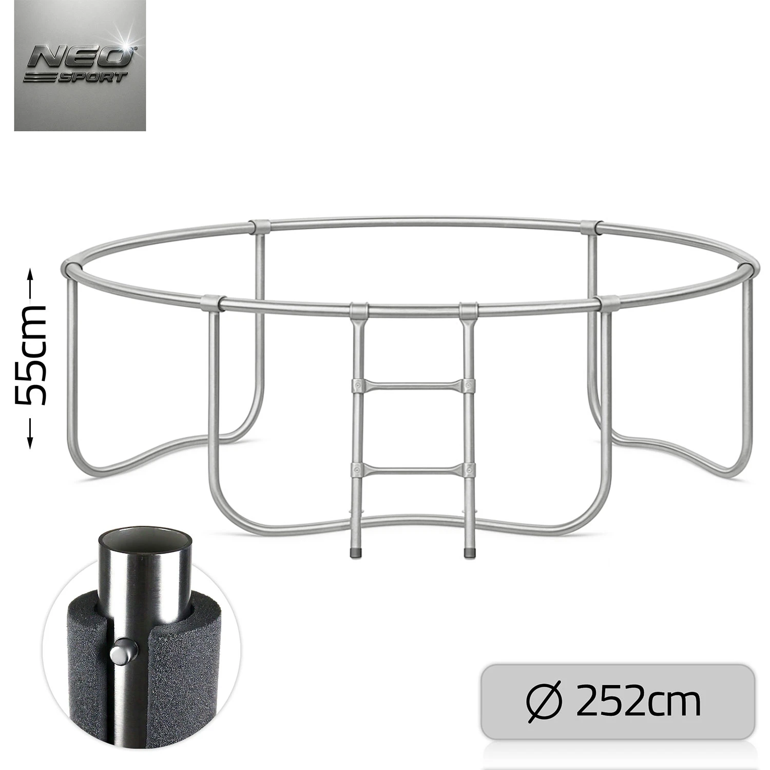 Trampolina NEO SPORT o imponującej średnicy 252 cm zapewnia mnóstwo miejsca do skakania – idealna dla dzieci i dorosłych!