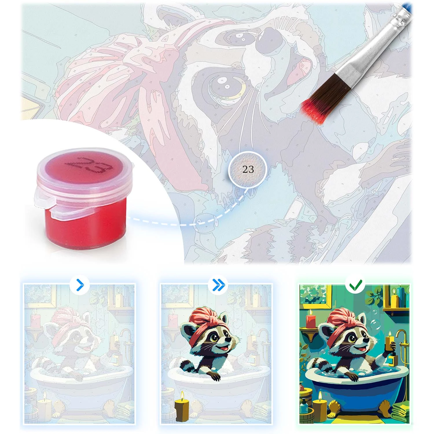1. Dopasuj farbę do numeru: każdy obszar na płótnie ma przypisany numer, który odpowiada konkretnemu kolorowi farby z zestawu.