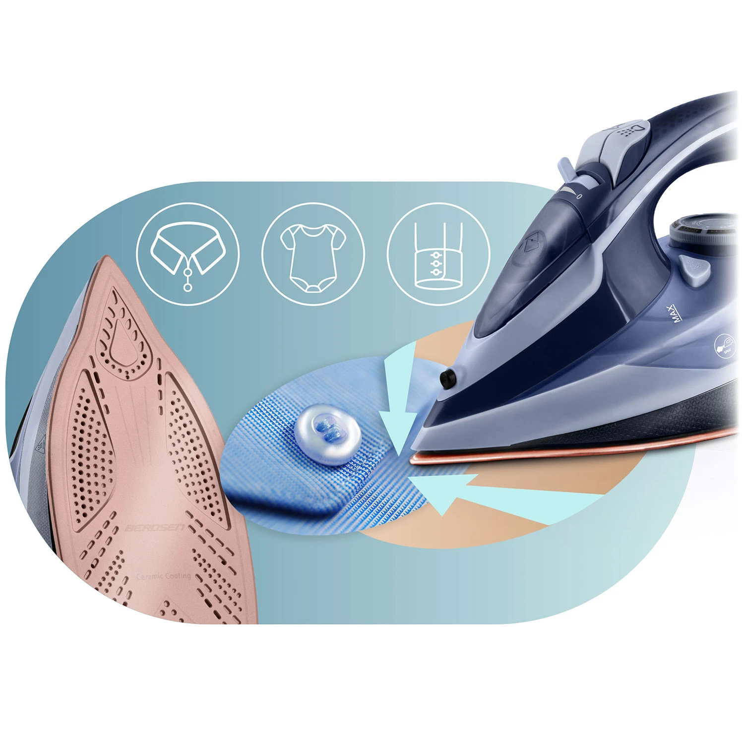✅ Ceramiczna stopa z mikrokanalikami – idealnie rozprowadza parę, dzięki czemu prasowanie jest szybsze i skuteczniejsze.