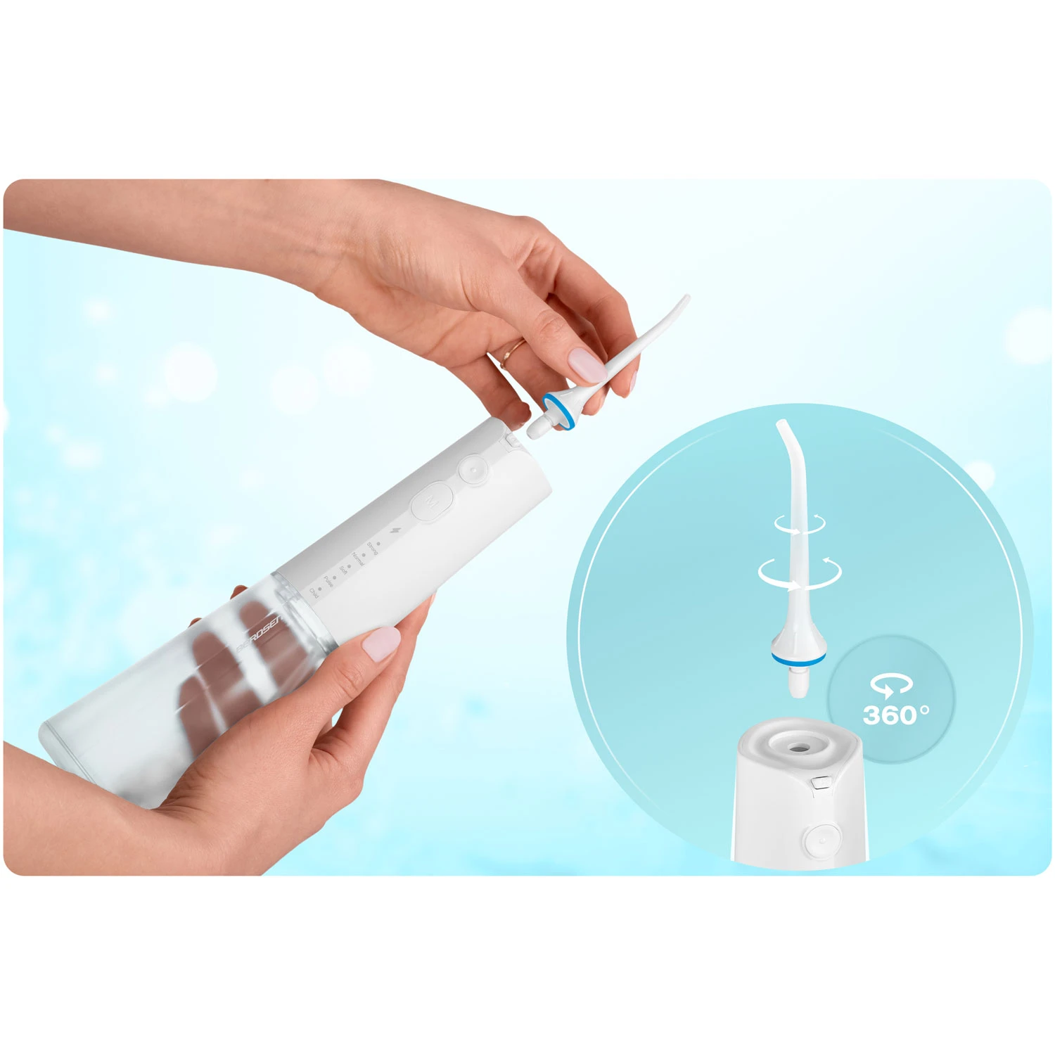5 TRYBÓW PRACY | 5 KOŃCÓWEK | CZĘSTOTLIWOŚĆ 1800 IMPULSÓW / MINUTĘ | TIMER | POJEMNIK 300 ML | BPA-FREE | IPX7 | ETUI PODRÓŻNE | OBRÓT DYSZ 360° | 30 DNI PRACY | USB-C GRATIS