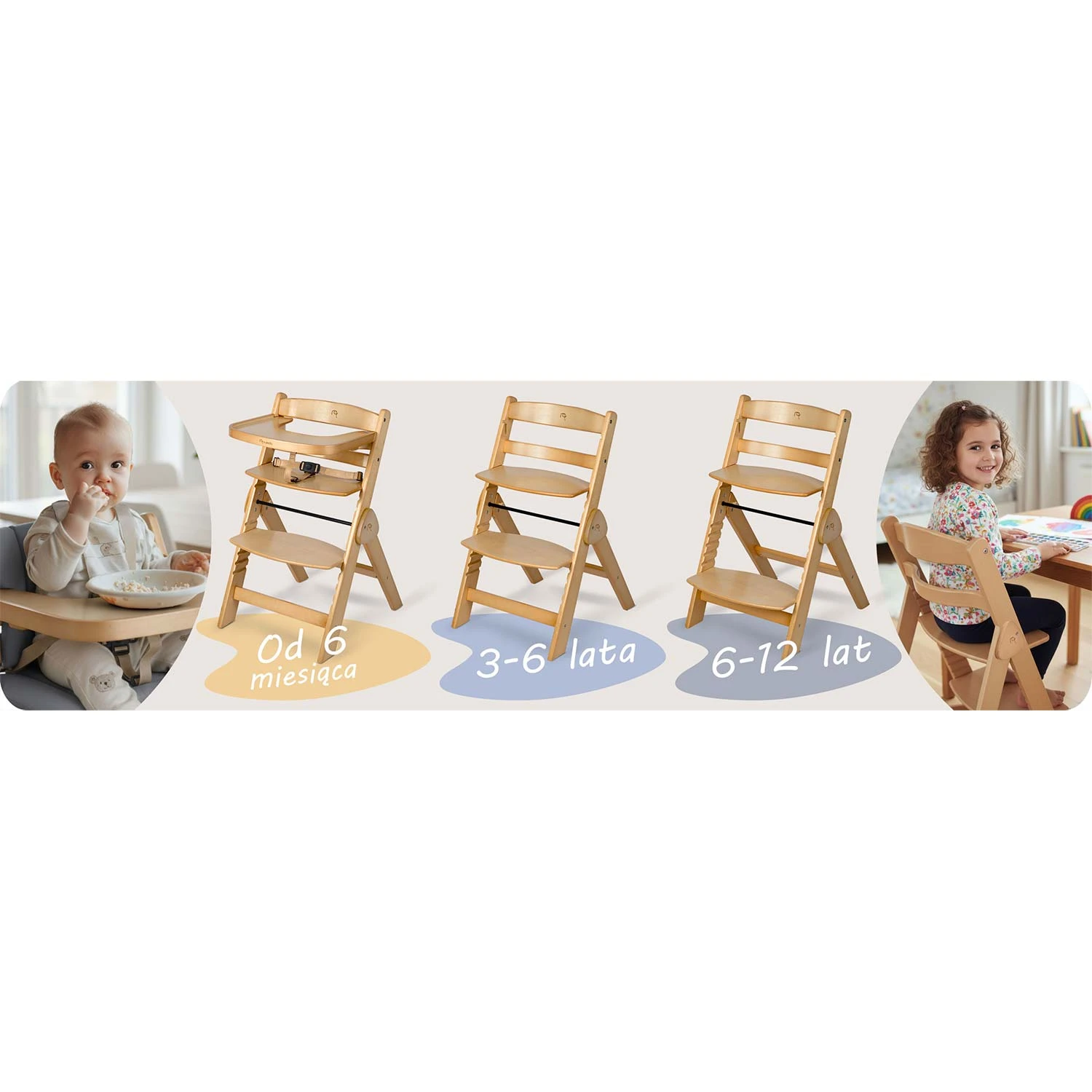 Zdejmowana tacka znacząco ułatwia utrzymanie czystości. Lakierowane drewno topolowe to gwarancja jakości. Zabezpieczone drewno nie pozwoli pochłonąć plam i krzesełko szybko wróci do perfekcyjnej czystości.