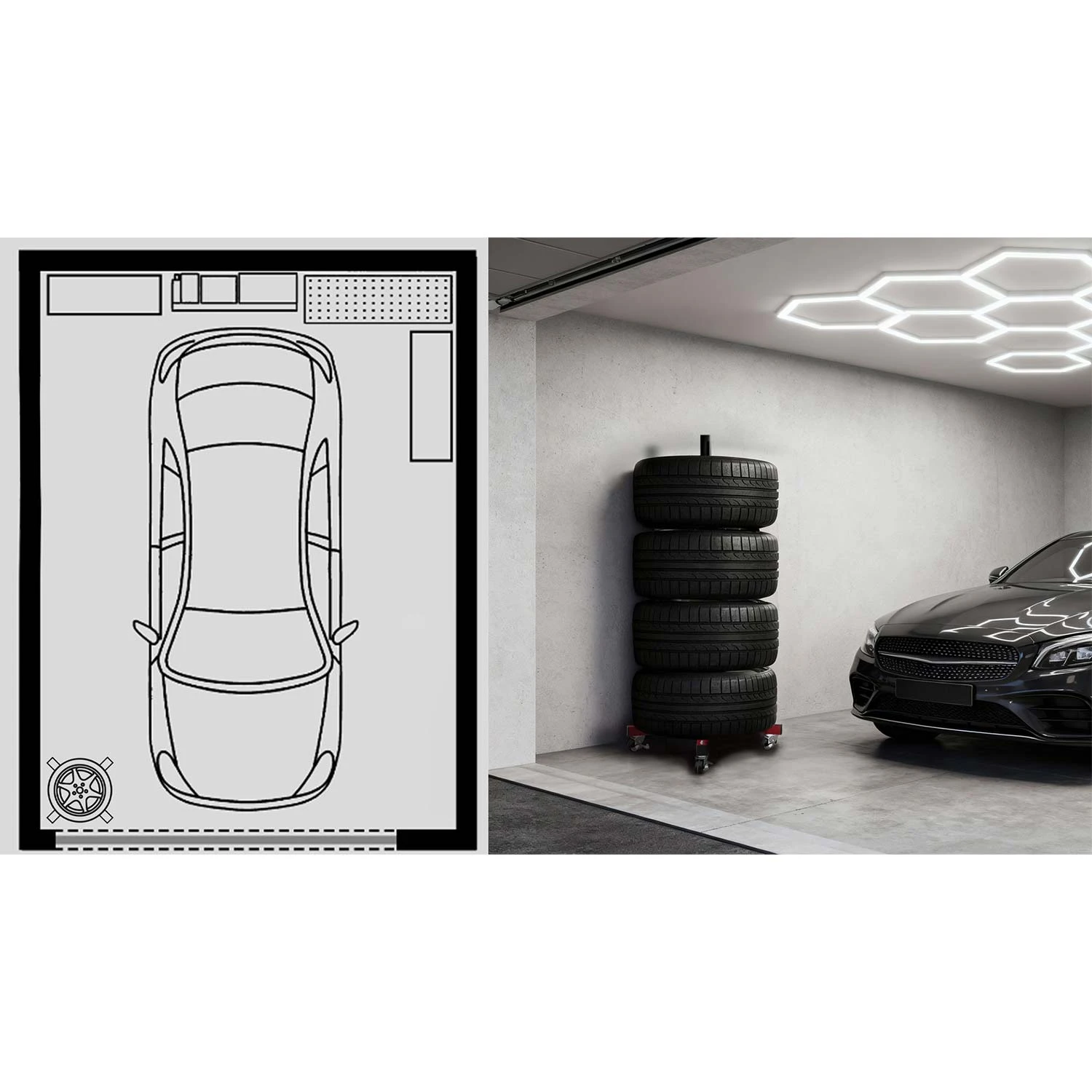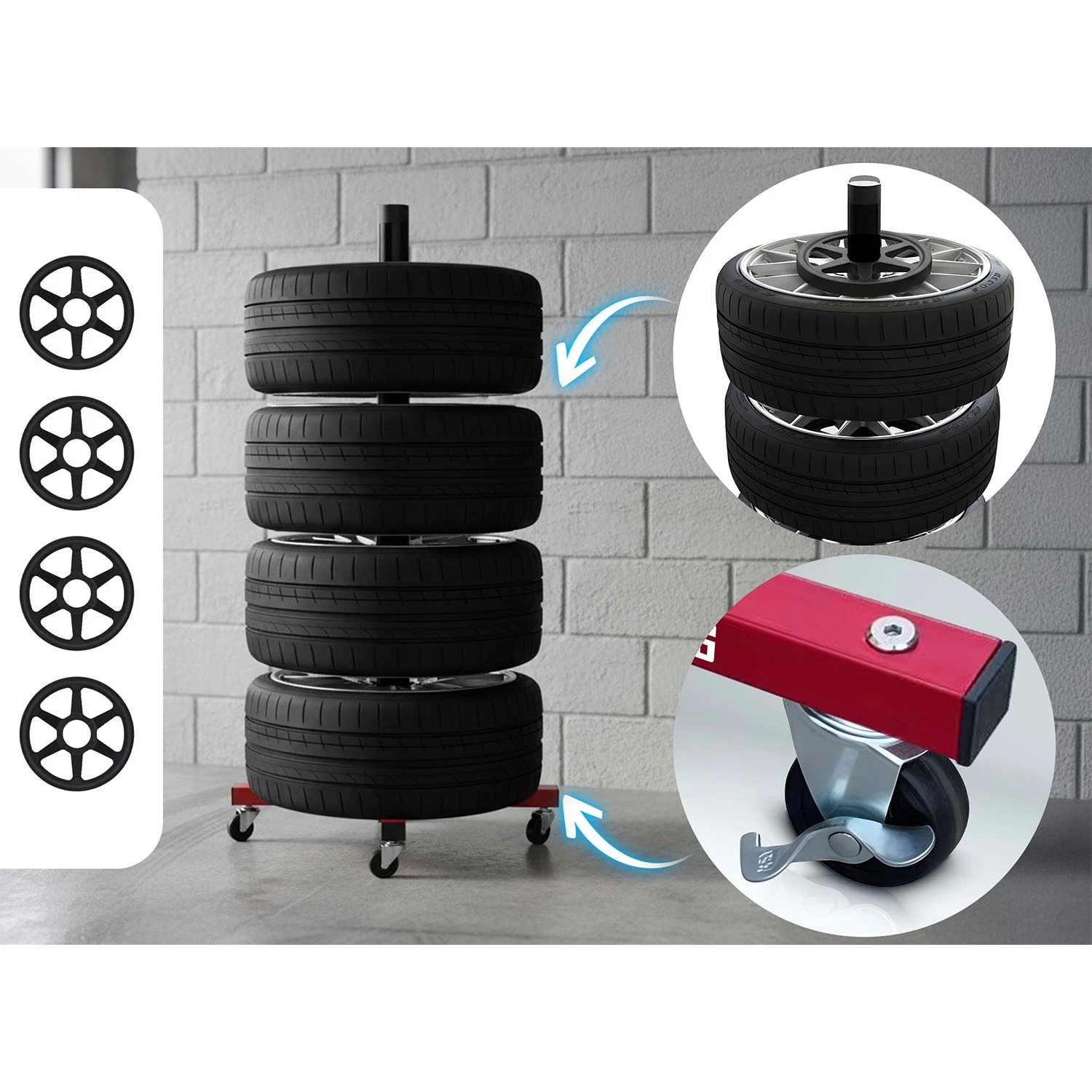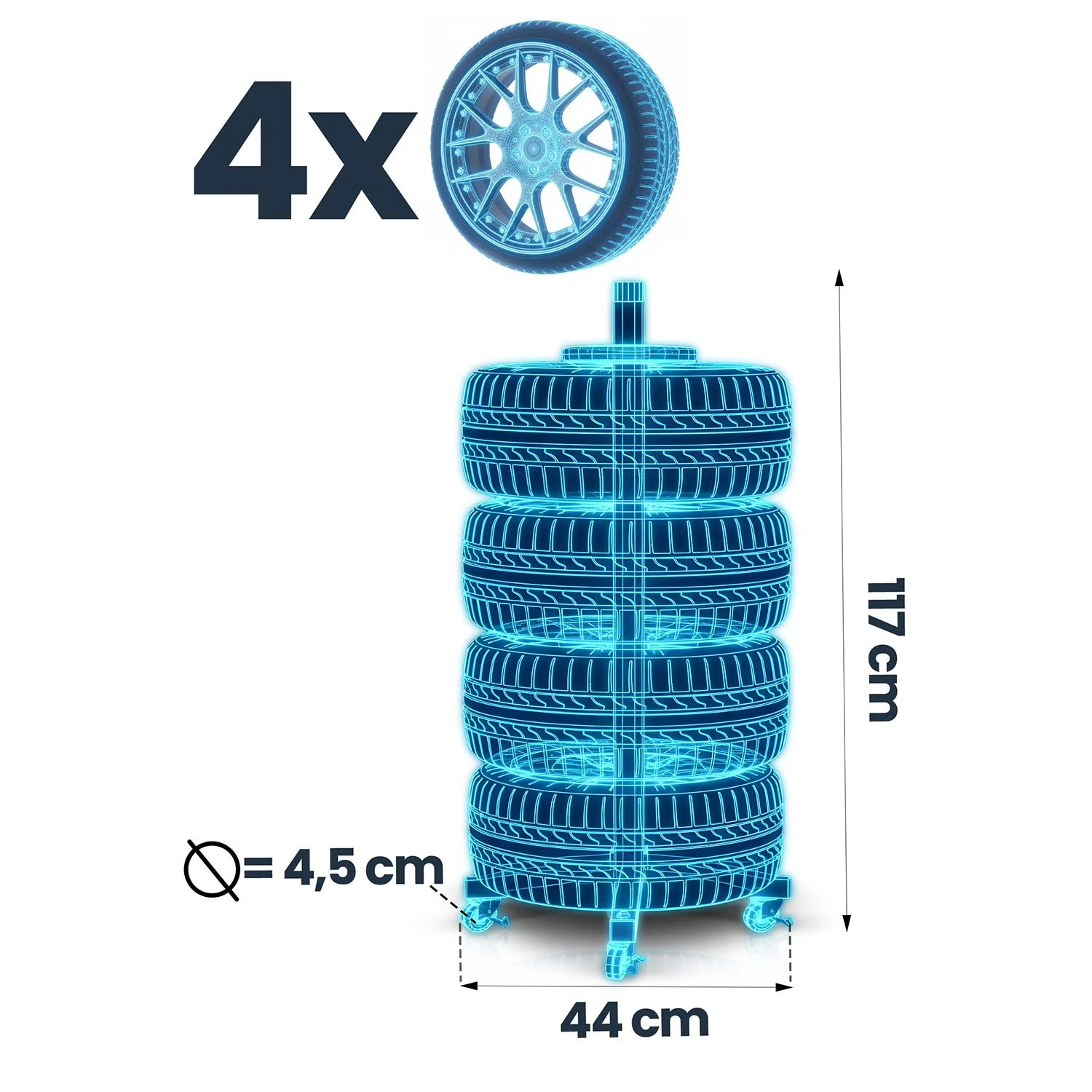 ✅ Oszczędność miejsca – kompaktowy stojak na opony umożliwia przechowywanie aż 4 opon bez bałaganu.