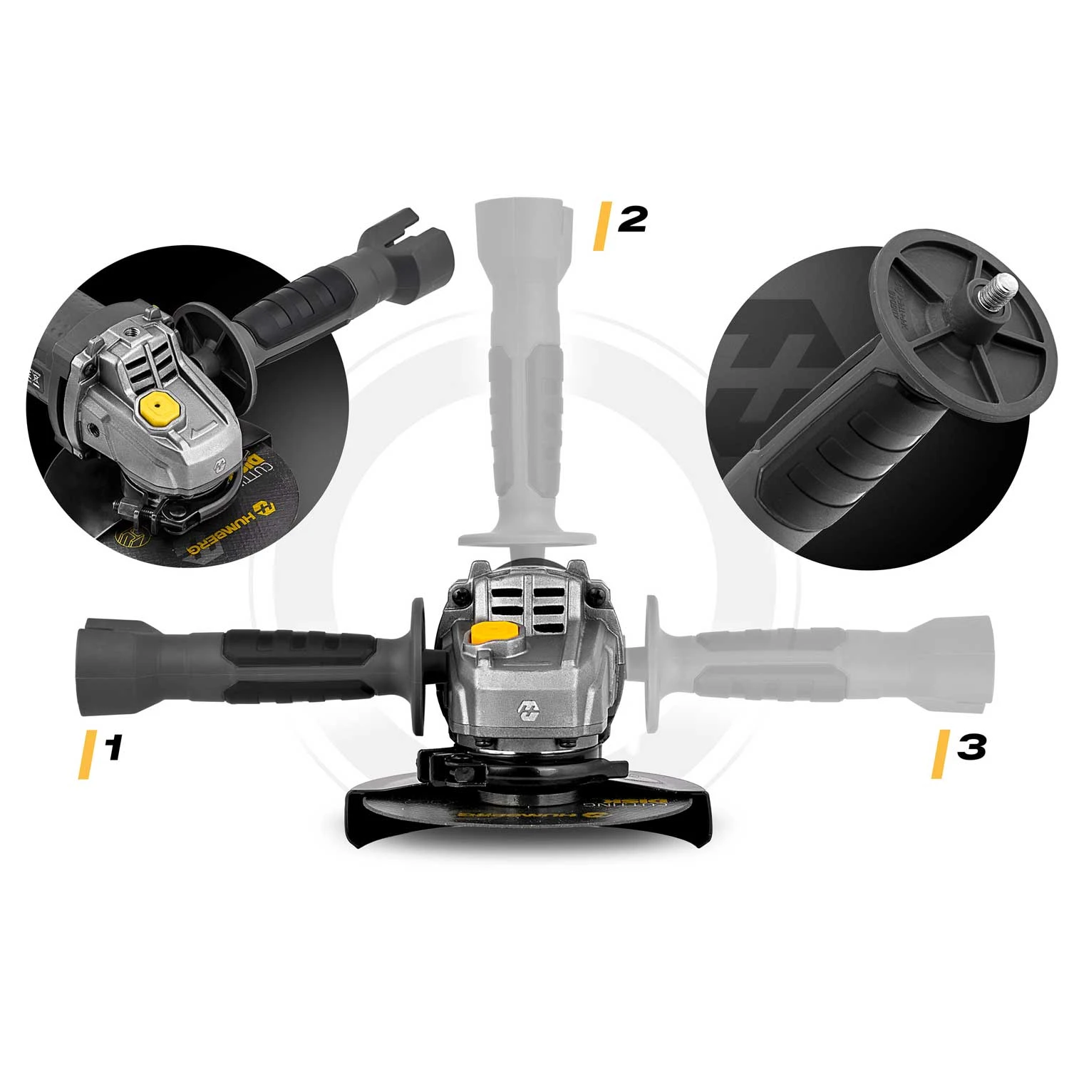 Z lewej strony, prawej strony lub od góry. Wygodna dla prawo i leworęcznych. Szybki montaż rękojeści — wkręcana na gwint.