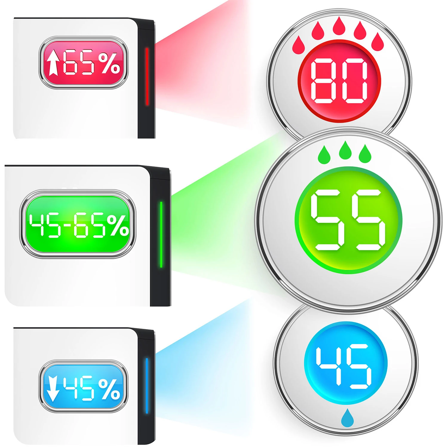 • Zielony – RH 45–65% → optymalny poziom – idealny mikroklimat.