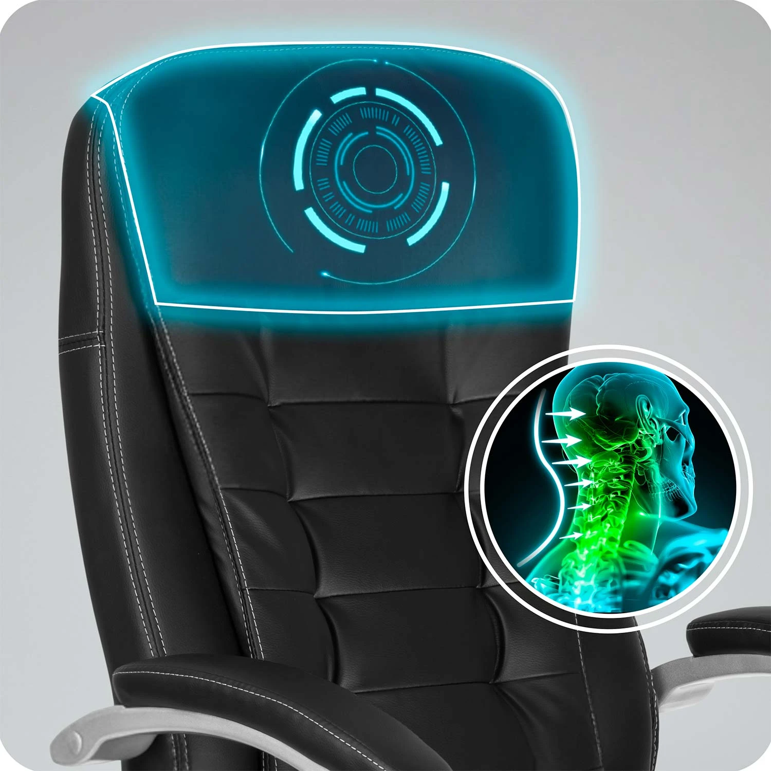 Wyprofilowana część lędźwiowa pomaga utrzymać ergonomiczną bezpieczną postawę. Wyprofilowany zagłówek równo rozkłada nacisk, odciążając mięśnie i zapobiegając bólom odcinka szyjnego.