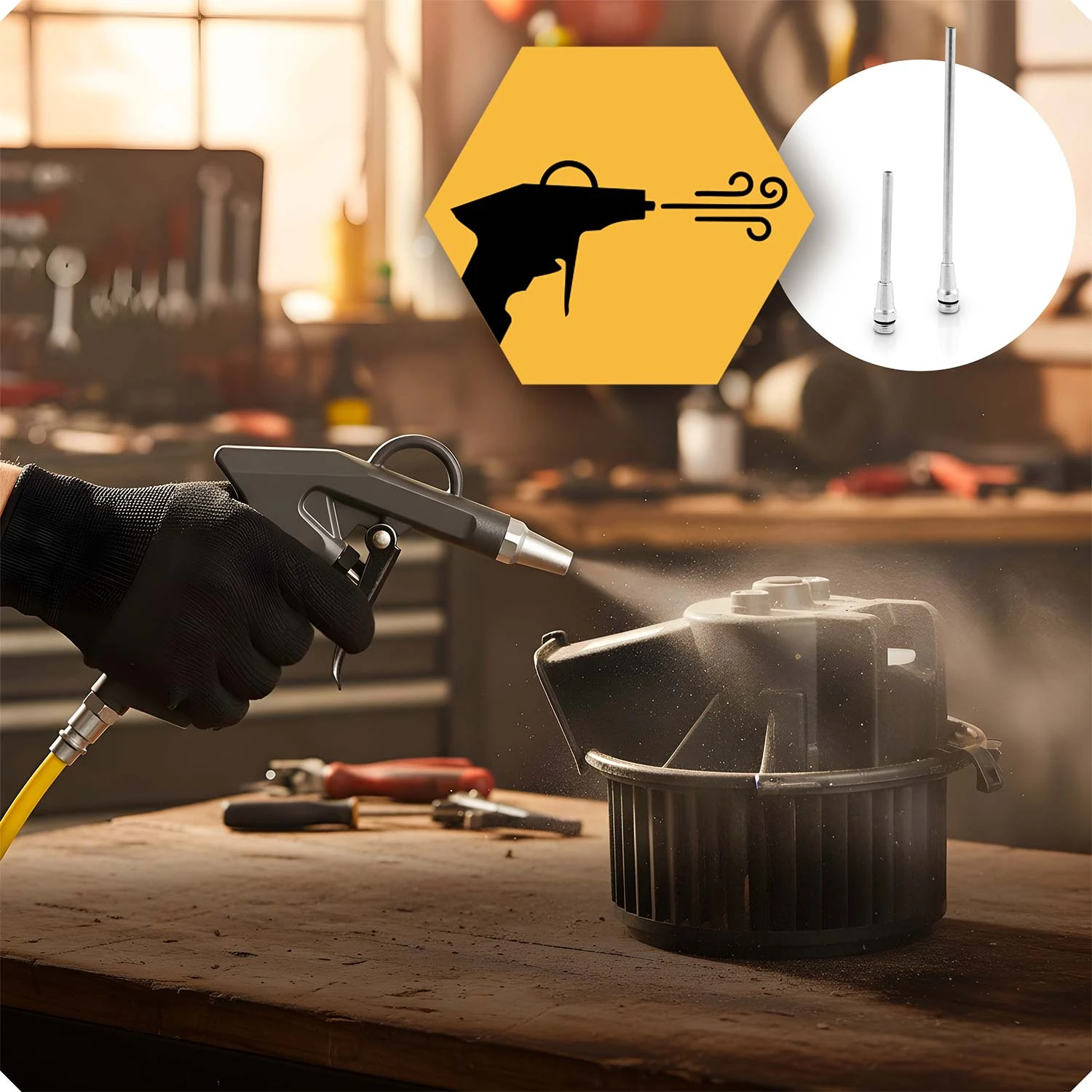 Pistolet do przedmuchiwania — precyzyjny i wygodny w użyciu — niezastąpiony do oczyszczania trudno dostępnych miejsc z kurzu, pyłu, trocin czy opiłków metalu.