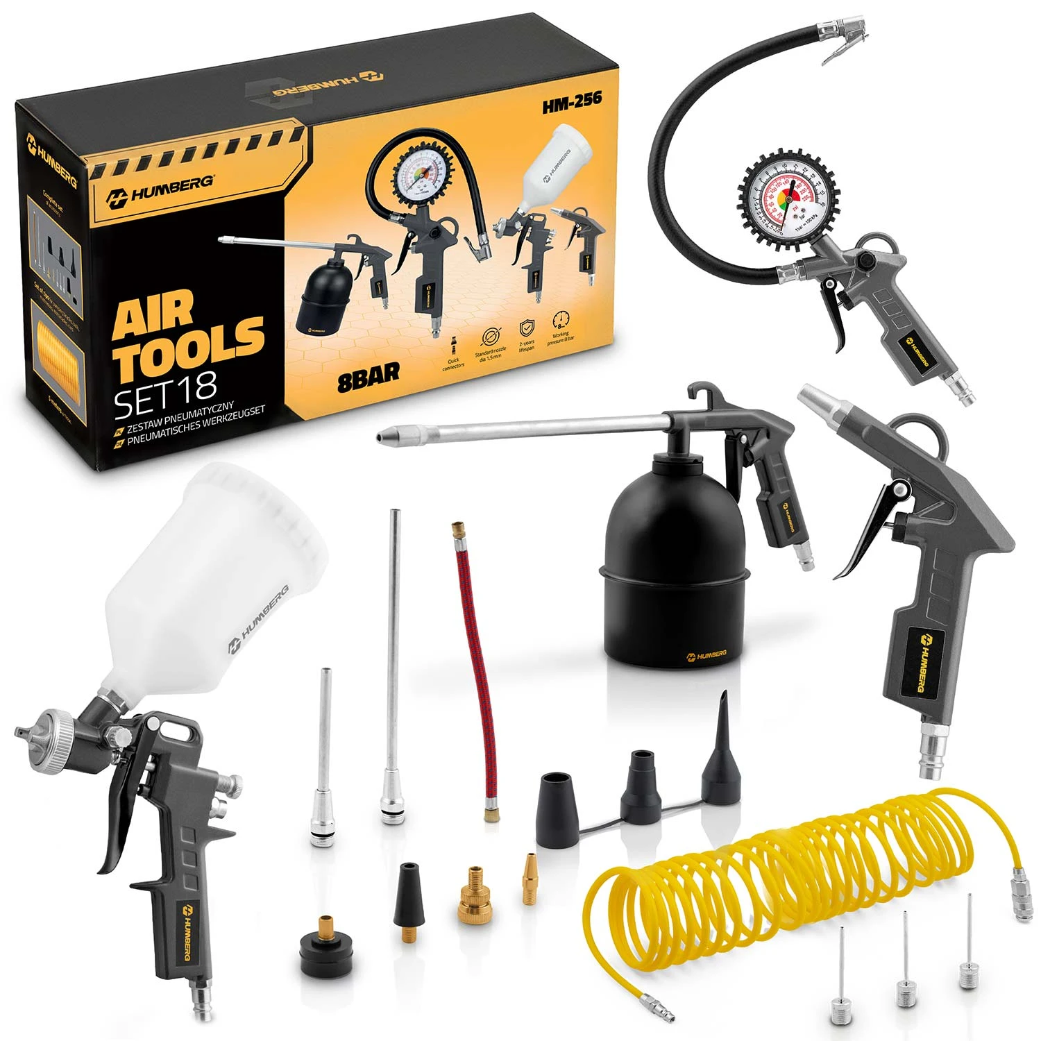 Znajdziesz tu: pistolety do malowania, pompowania, przedmuchiwania i mycia, wąż spiralny, końcówki do piłek, materacy i opon, adaptery, dysze i szybkozłączki – aż 18 elementów, które pozwolą Ci działać szybko, wygodnie i profesjonalnie.