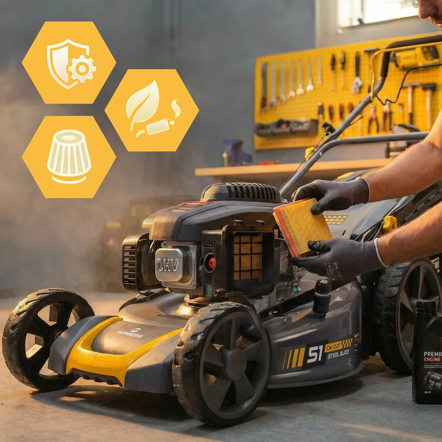 Dzięki silnikowi 3,5 kW (≈ 4,8 KM), szerokości koszenia 51 cm i wspomaganiu napędu, pracuje pewnie i stabilnie, zapewniając idealnie równą murawę w Twoim ogrodzie. Trzy tryby pracy – zbieranie, wyrzut boczny i mulczowanie – pozwalają dopasować cięcie do każdego rodzaju trawy.