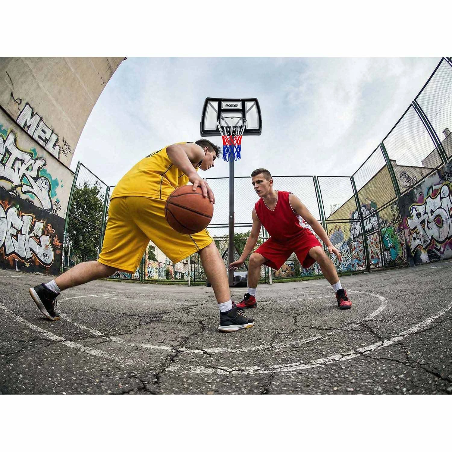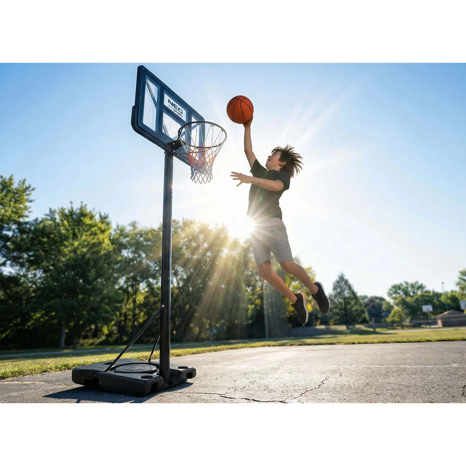 Złap za piłkę i rozkręć grę – gdzie chcesz, kiedy chcesz. Składany, mobilny kosz Neo-Sport to pełna wolność grania: od podwórka po parking.