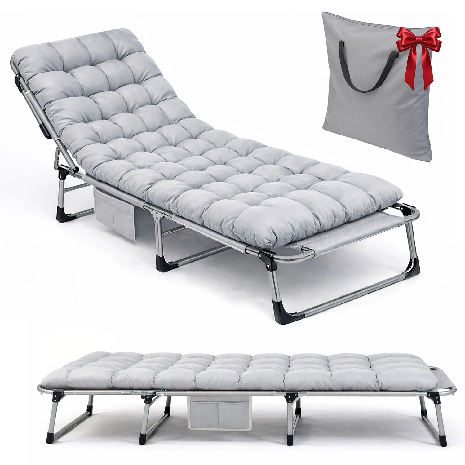 Uniwersalny, szary kolor sprawia, że składane łóżko-leżak świetnie pasuje zarówno do ogrodu, jak i na działkę czy biwak.