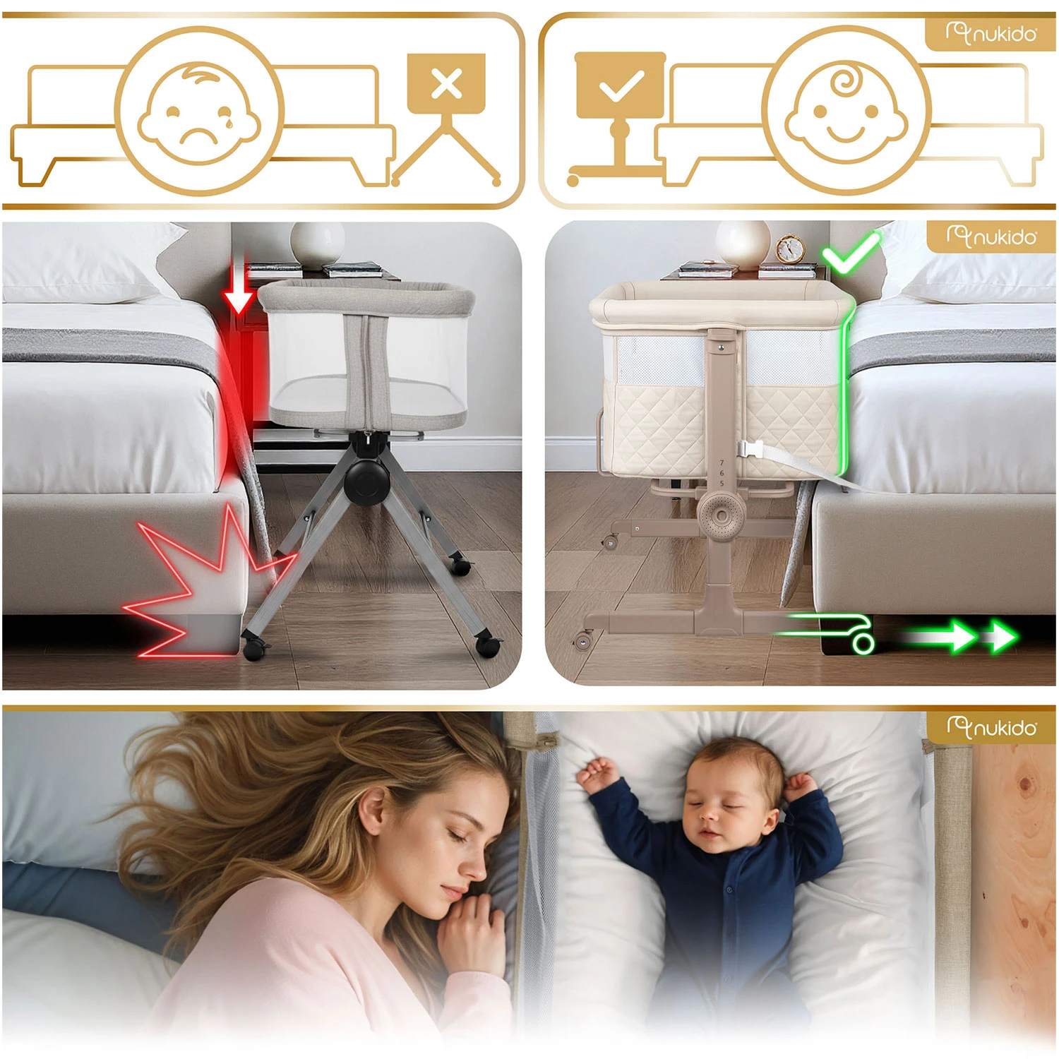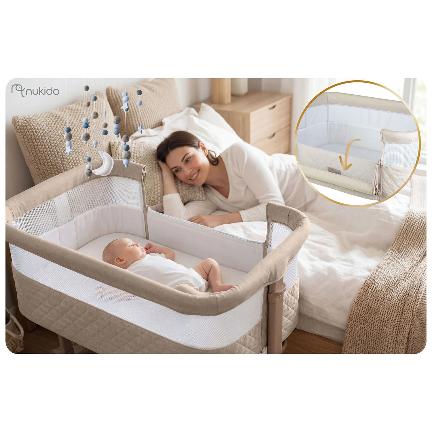 Łóżeczko dostawne sprawdzonej marki NUKIDO zapewnia dziecku bezpieczną przestrzeń do snu. Maluszek jest blisko rodziców, co ułatwia budowanie więzi i zapewnia poczucie bezpieczeństwa.