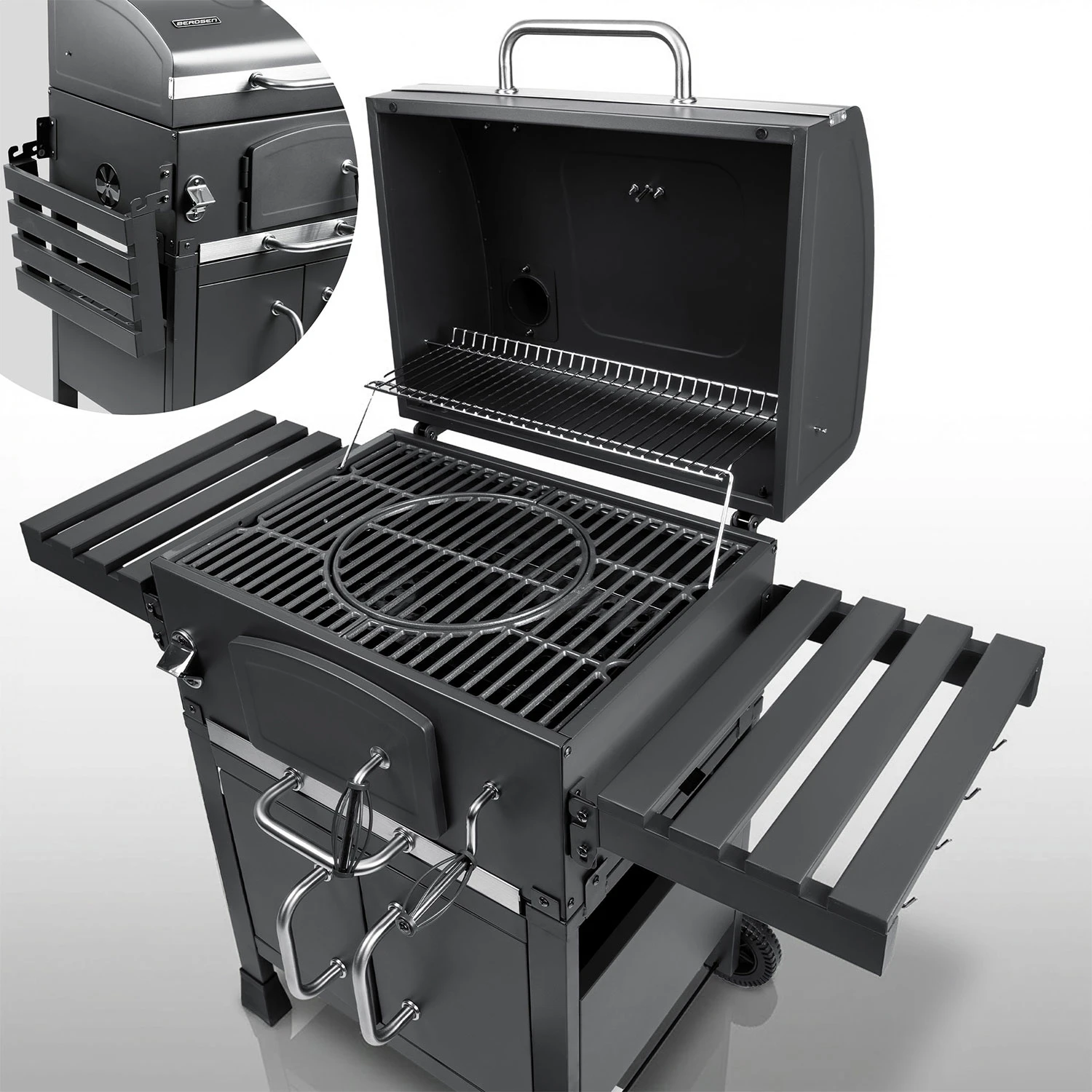 ✅ Składane półki boczne, czyli więcej miejsca wtedy, gdy go potrzebujesz. Grill został wyposażony w praktyczne składane półki boczne, które zwiększają wygodę przygotowywania potraw i organizację pracy przy ruszcie. To idealne miejsce na talerze, przyprawy, marynaty, akcesoria do grillowania czy gotowe dania.